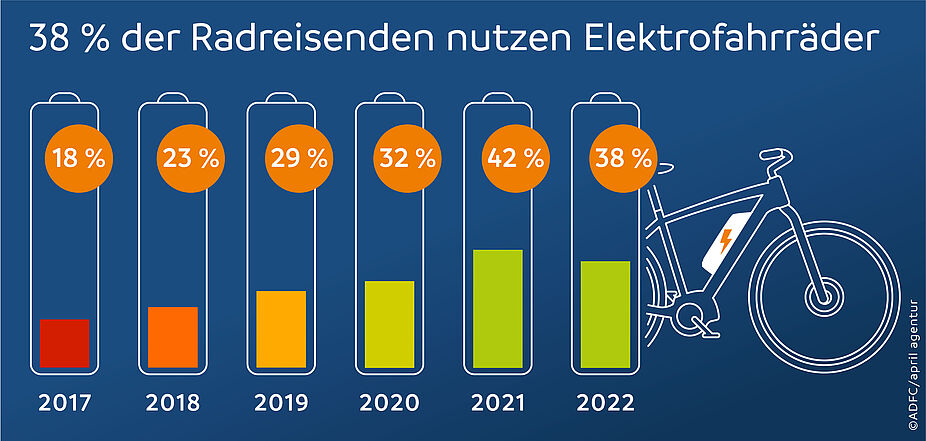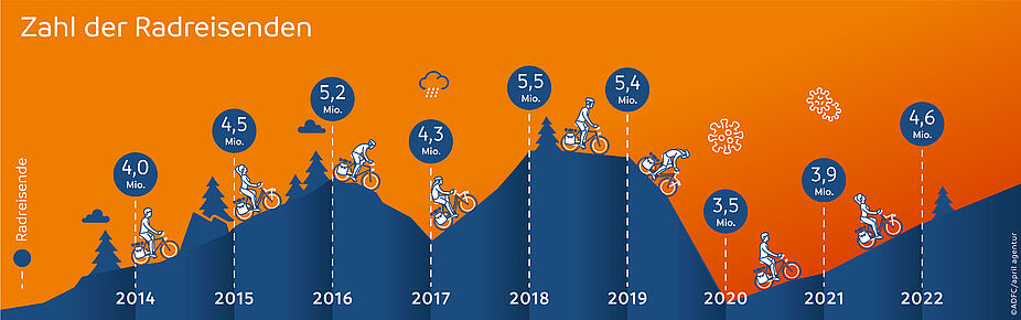 Auch für längere Reisen gewinnt das Rad wieder an Bedeutung. Nach einem pandemiebedingten Rückgang in den vergangenen Jahren ist jetzt ein klarer Aufwärtstrend erkennbar. 2022 haben sich 4,6 Millionen Menschen für eine Reise mit dem Rad entschieden, im Vorjahr waren es noch 3,9 Millionen. Damit haben die Zahlen fast das Vor-Corona-Niveau erreicht.